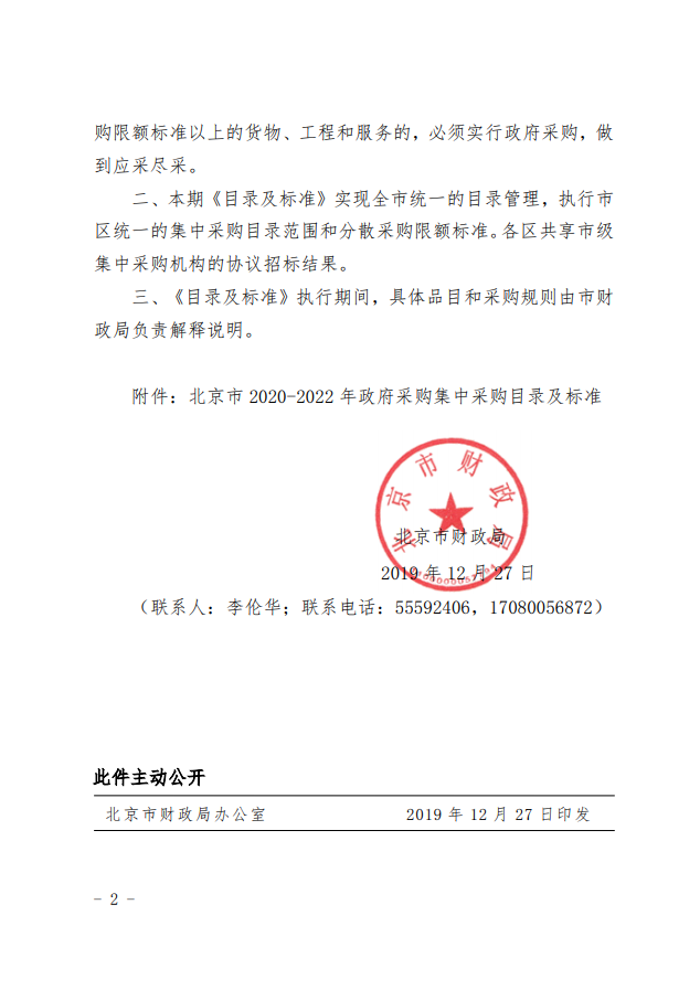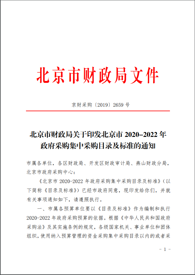 北京市财政局关于印发北京市 2020-2022 年 政府采购集中采购目录及标准的通知